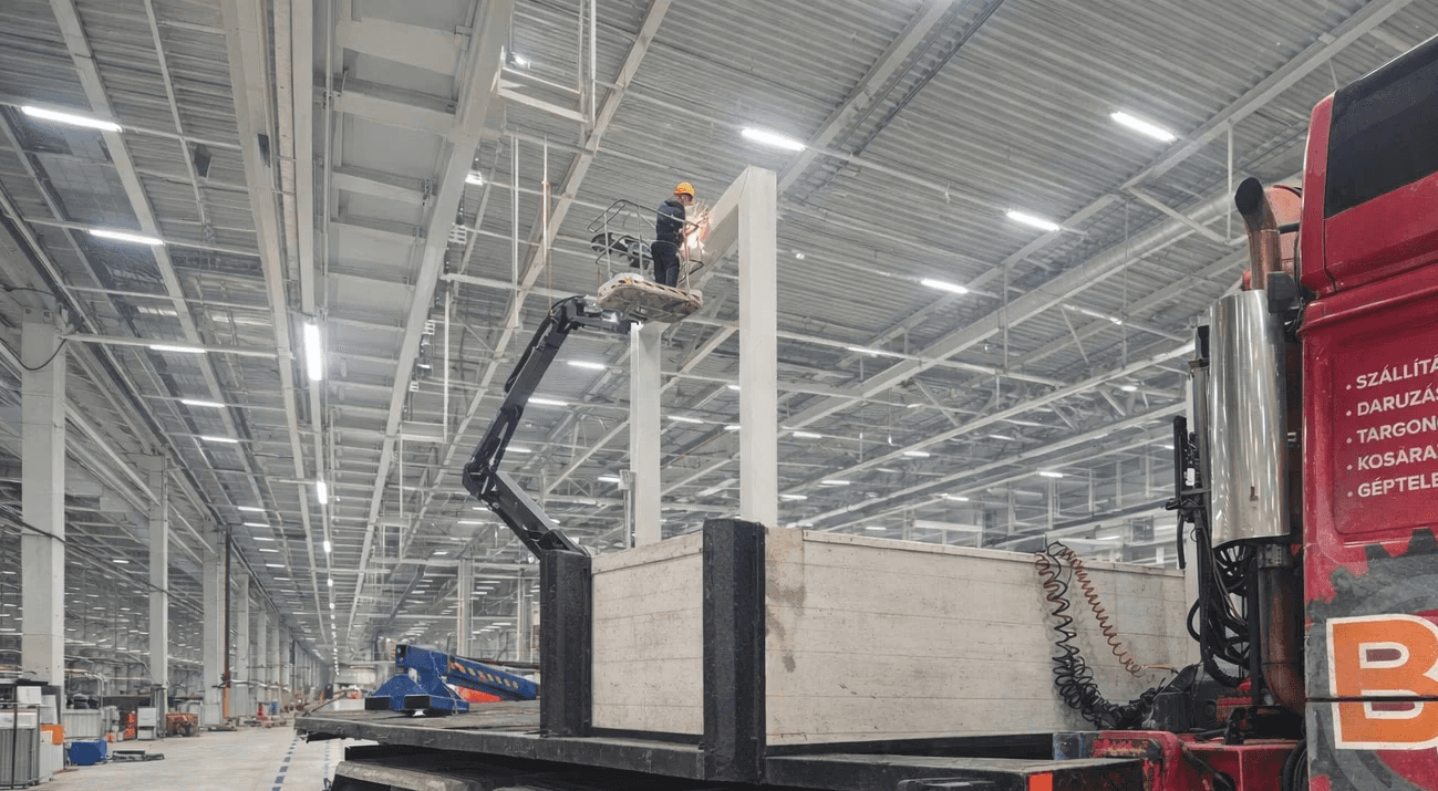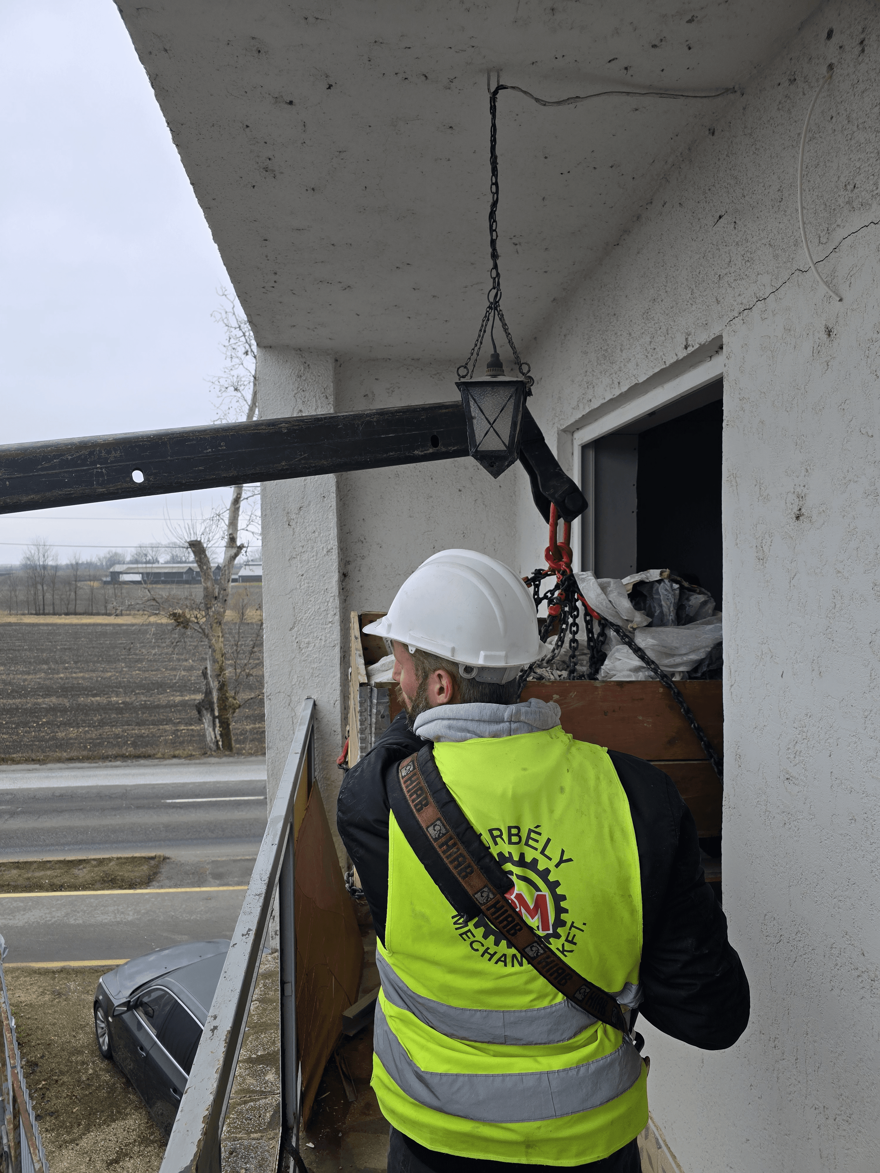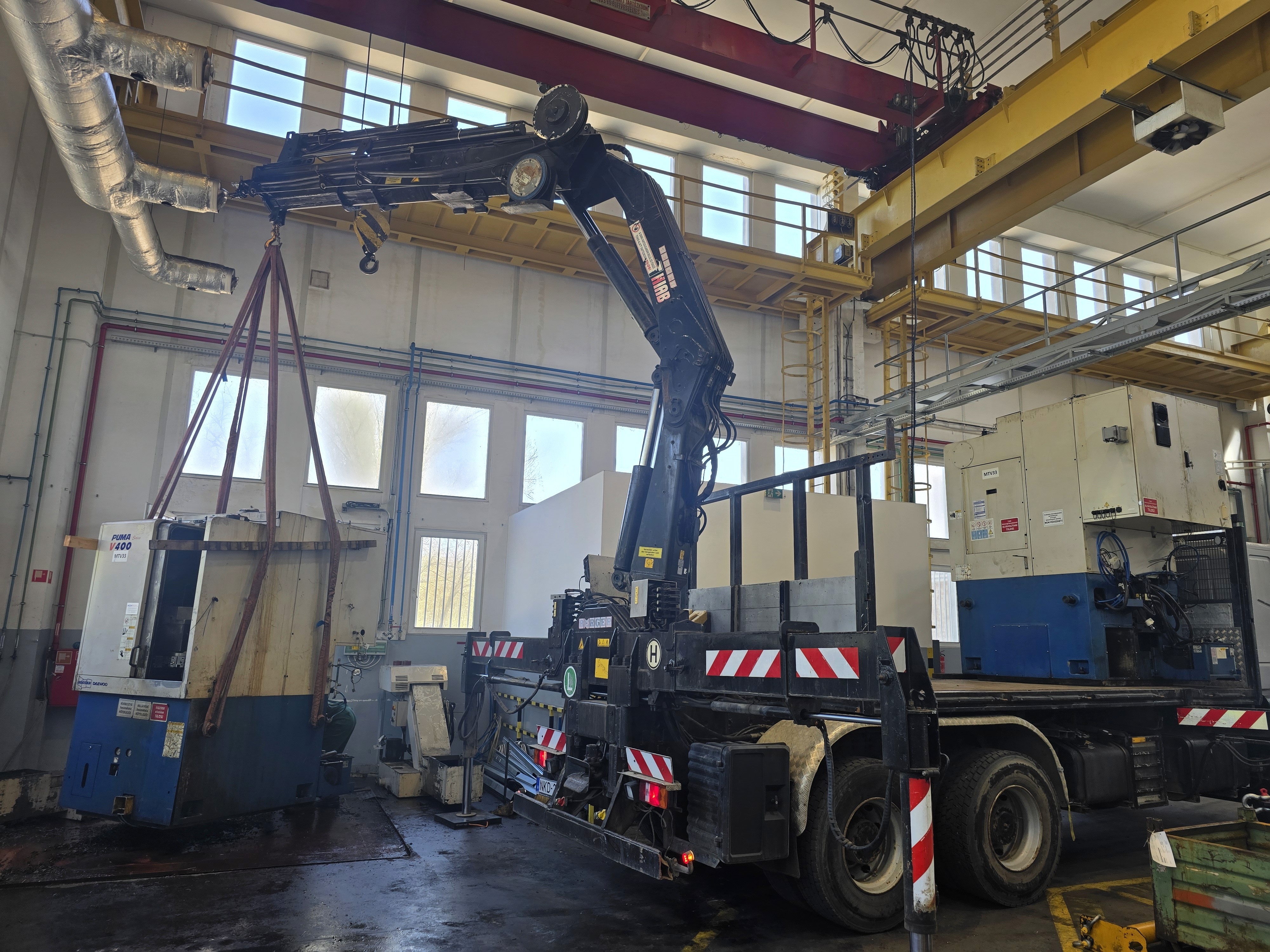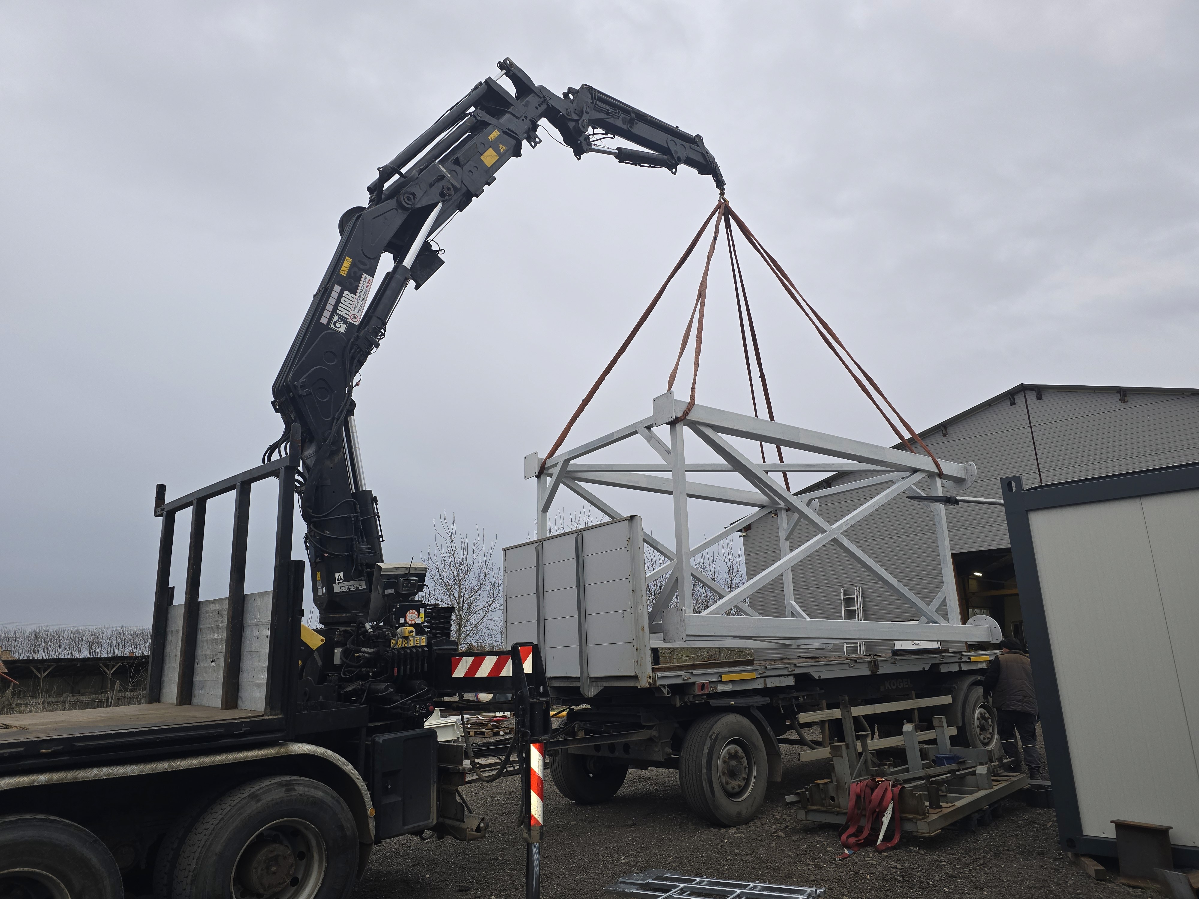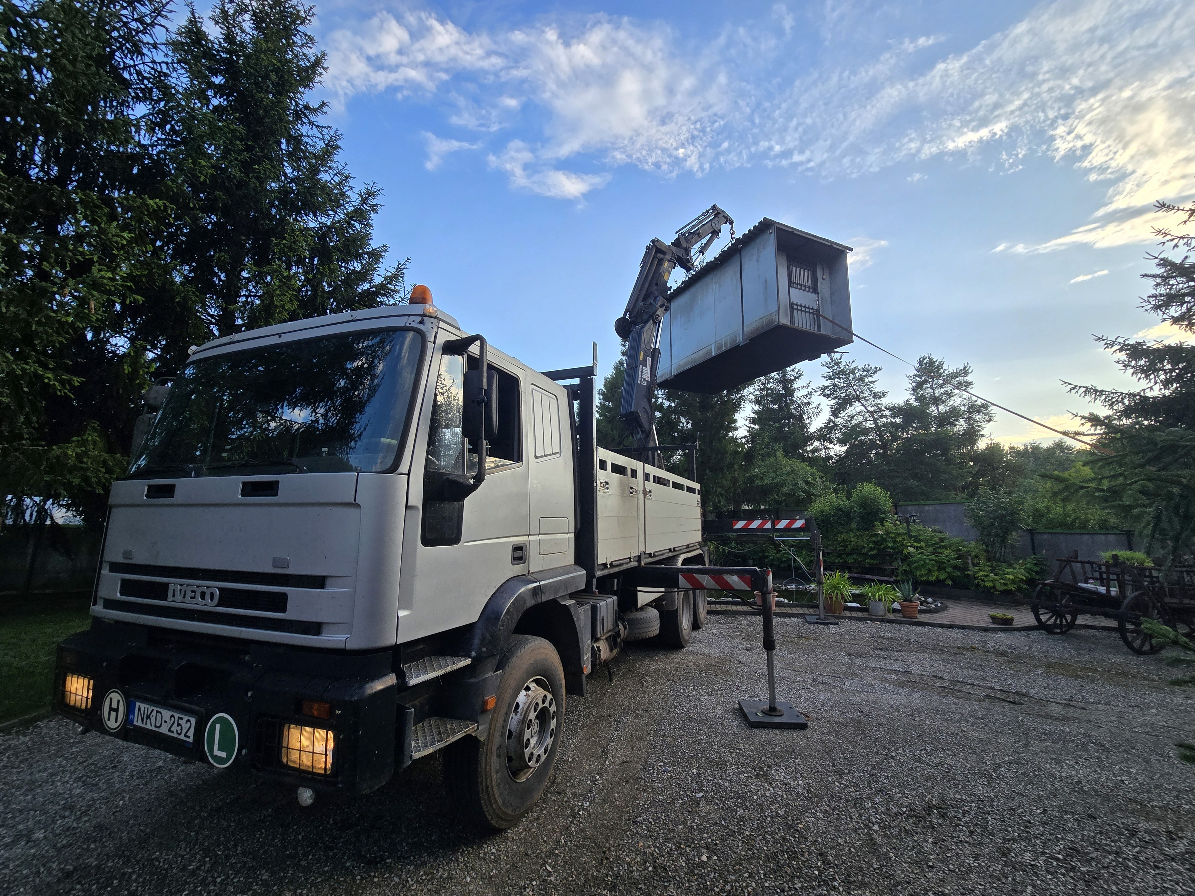 Teherautóra szerelt hidraulikus daruval (KCR daru) dolgozunk, amely gyorsan bevethető, nagy teherbírású, és szűk helyeken is hatékonyan használható. Ez a darutípus sok esetben kiváltja az engedélyköteles autódaruzást, nem igényel külön szállítójárművet, így a munkák gyorsabban és kevesebb költséggel elvégezhetők.
